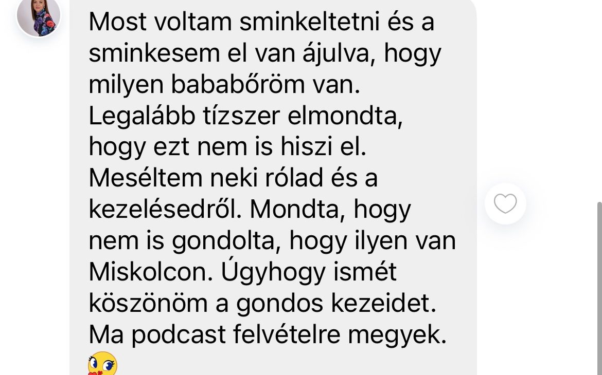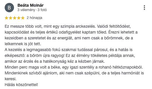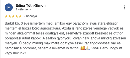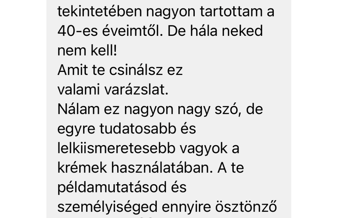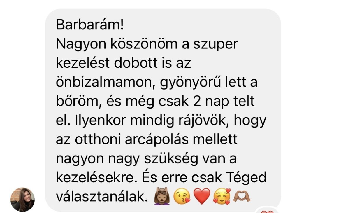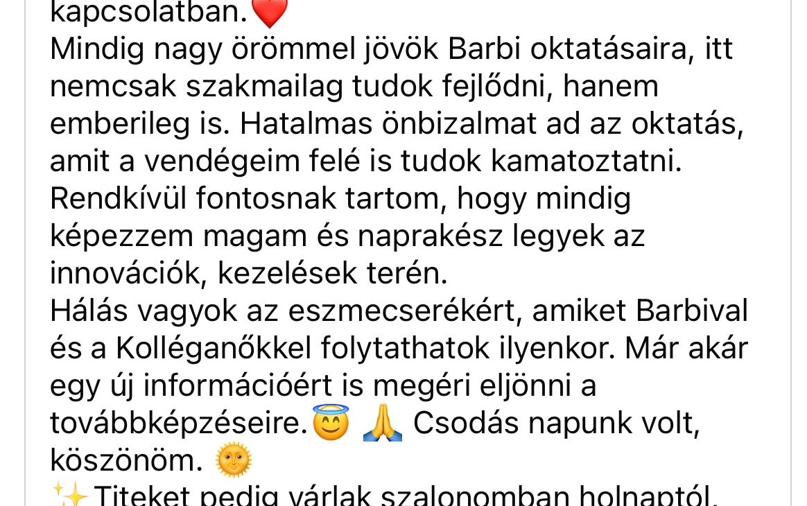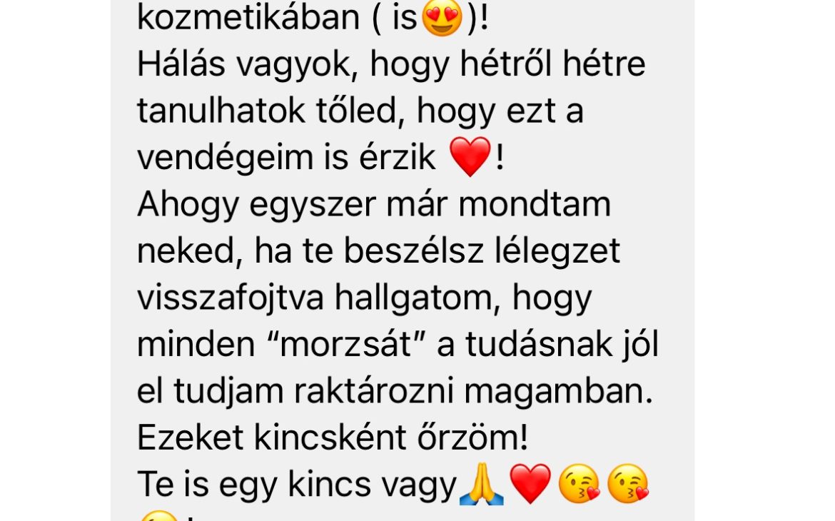 Szeretném minden kedves vendégemnek a szép és egészséges bőr élményét adni, hogy együtt természetesen, tartósan őrizhessük meg szépségüket. A folyamatos továbbképzés elengedhetetlen számomra, hogy megfeleljek vendégeim valamint saját magam igényeinek. Kiemelt feladatomnak tekintem, hogy bőregészség egyensúlyának megbillenése következtében kihívásokkal küzdő vendégeknek hatékony megoldással segítsek elérni a ragyogó bőr érzését.